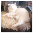 weiß mit grauem Fleck auf dem Kopf und grauem Schwanz, sehr dichtes, längeres Fell - Bobby kann aufgrund einer Missbildung nicht miauen oder schnurren, ansonsten ist er aber gesund - er ist recht groß, hat sehr dicke Pfoten und längeres, dichtes Fell (wie ein Eisbär)