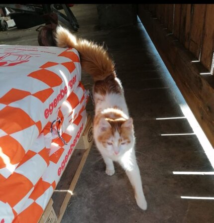 Er ist recht zutraulich, hatte kein großes Revier und war immer in Rufnähe um das Grundstück. Am rechten Ohr hat er einen Cut, es fehlt ein kleines Stück.