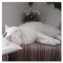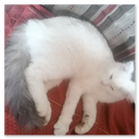 weiß mit grauem Fleck auf dem Kopf und grauem Schwanz, sehr dichtes, längeres Fell - Bobby kann aufgrund einer Missbildung nicht miauen oder schnurren, ansonsten ist er aber gesund - er ist recht groß, hat sehr dicke Pfoten und längeres, dichtes Fell (wie ein Eisbär)