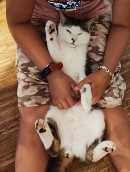 Schwarzer Fleck an der Schnauze und an der rechten Pfote.