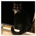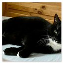 schwarz mit weissem Schnäuzchen, weissen Latz, weisse Flecken zwischen den Vorder- und Hinterbeinen, weissen Pfötchen und weissen Schnurrhaaren, Nasenleder ist schwarz